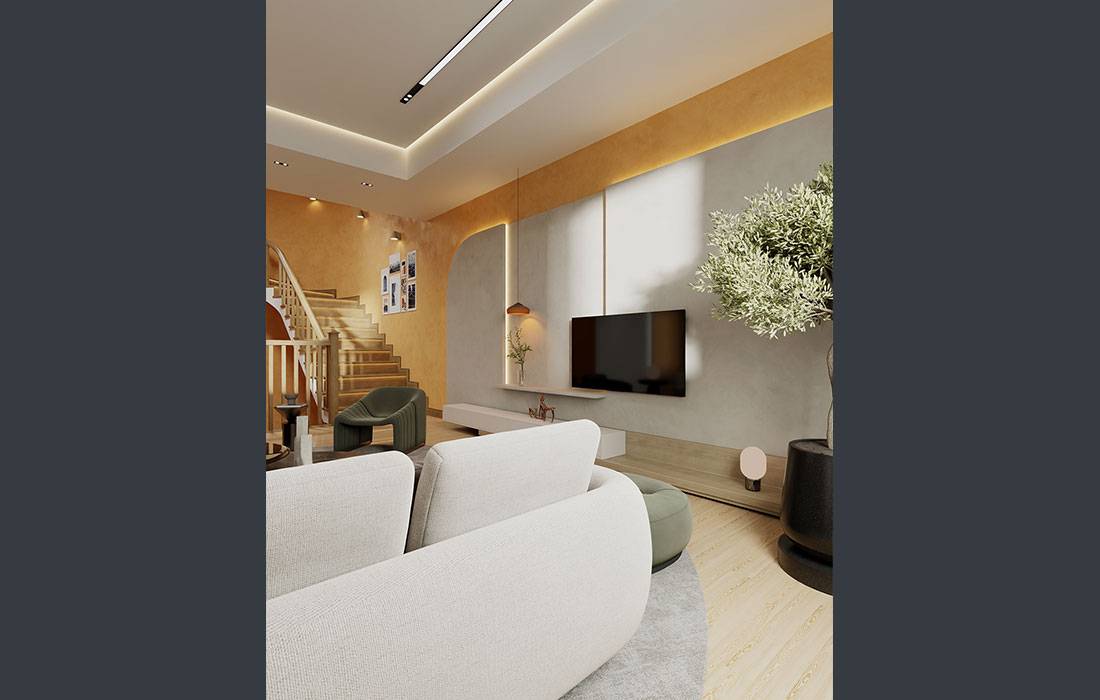 This wall extends toward the staircase, connecting vertical levels through a gentle current of life. At the end of its path, it meets a curved ochre-toned wall — its earthy hue inviting softness, movement, and human connection into the space. A quiet but powerful shift occurred beneath. We replaced the old reddish-brown flooring with soft, natural-toned wood. This new surface breathes — it reflects light more openly, offering a calm, grounding experience that bridges the human body with the earth beneath.